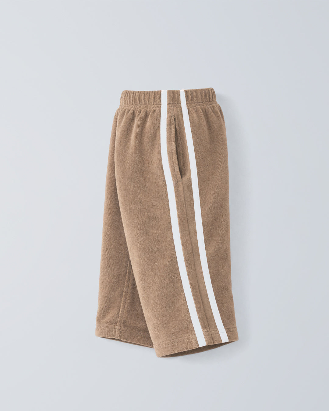 Superweiche, locker geschnittene Pants mit elastischem Bund, Seitentaschen und zwei Streifen an der Seite. Gefertigt aus hochwertigem, leichtem Frottee aus 100 % Bio-Baumwolle.